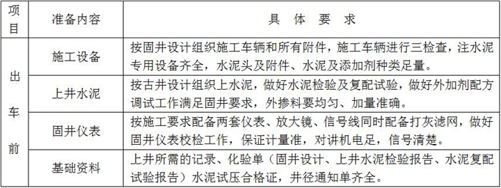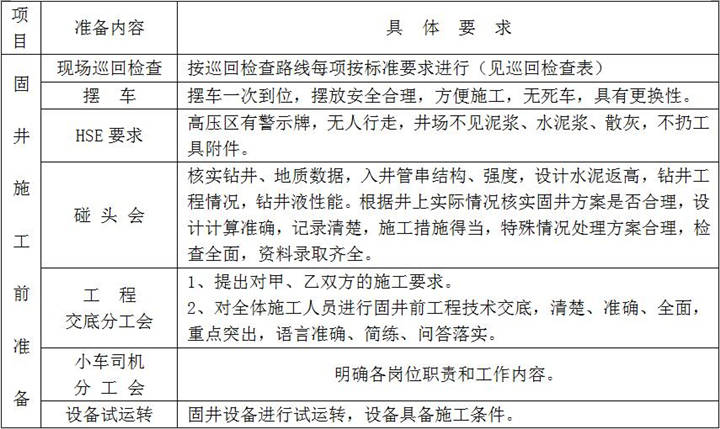 固井施工準(zhǔn)備是落實(shí)固井施工方案和固井設(shè)計(jì)重要的一個(gè)環(huán)節(jié),是固好一口井的前期準(zhǔn)備工作,具體內(nèi)容及要求如下: