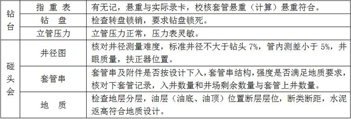 2、固井施工:按設(shè)計(jì)注入隔離液,水泥漿壓膠塞,頂替鉆井液、碰壓、試壓完成、固井施工過程檢查點(diǎn)項(xiàng)及要求如下: